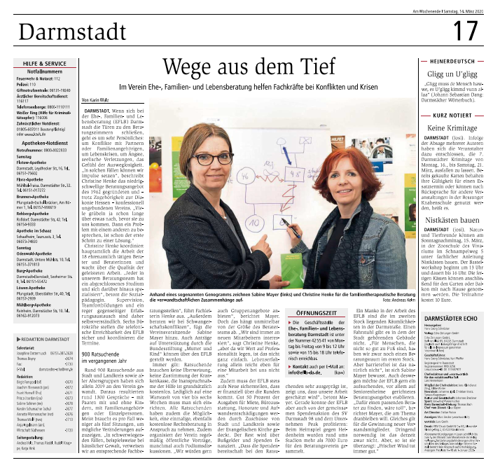 Die Ehe-, Familien- und Lebensberatung Darmstadt e.V. ist ein gemeinnütziger Verein und finanziert sich durch Spenden bzw. Zuwendungen. Sie möchten uns unterstützen?